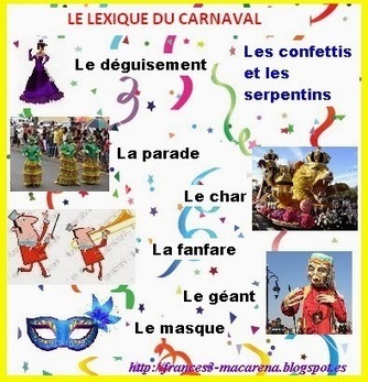 Carnaval est une fête célébrée entre l'Épiphanie et Mardi- Gras. La date n’est pas fixe, et des parades ont lieu dans les villes à différentes dates. Lors de ces défilés, les gens marchent dans la rue, accompagnés par de grands chars fabriqués par des carnavaliers. Les participants portent des déguisements (de fées, de sorcières, de pirates, de clowns,…) ou cachent leur visage sous un masque ou du maquillage. Ils peuvent aussi porter une perruque sur les cheveux. Les participants lâchent des ballons, lancent des confettis multicolores ou de longs serpentins. Il y a de la musique, et les gens chantent et dansent. Dans les boulangeries, on peut acheter des délicieux vbeignets, avec ou sans confiture. Les carnavals les plus connus en France sont les carnavals de Nice et de Dunkerque